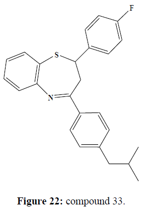 A novel series of 1,5-benzothiazepine derivatives synthesized by the reaction of isobutyl chalcones with 2-aminothiophenol [17]. Among the halogens, fluorinated compound (32) shown potent activity with MIC 0.4 μg/mL and 1.6 μg/mL against Staphylococcus aureus and Candida albicans respectively. The compound (33) was also more active than the standard drugs against Staphylococcus aureus, Proteus vulgaris and Aspergillus niger (MIC 0.8 μg/mL) and Candida tropicalis (1.6μg/mL) (Figure 21,22).