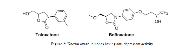 The effectiveness of latest generation of antibiotics is gradually decreasing towards the treatment of numerous infectious diseases due to the newly emerging resistance mechanism developed inside the microbial. This led to the extensive research and there by discovery of new antibiotics for the treatment of various diseases. N-Aryloxazolidinones and the corresponding derivatives are known to be effective against Vancomycin-Resistant Enterococii (VRE) and Methicillin-Resistant Staphylococcus Aureus (MRSA) [1]. The oxazolidinone derivatives, linezolid and posizolid (Figure 1) are found to be active against bacterial infection. Interestingly oxazolidinones also have shown pharmacological activity as antidepressant and antisychosis [2]. Toloxatone and befloxatone (Figure 2) are used for the treatment of depression as a reverse inhibitor of MAO-O [3]. Some of the oxazolidinone derivatives are also employed as key structural fragments in biologically active materials for pharmaceutical use [4] and also as auxiliaries in useful synthetic conversations [5].