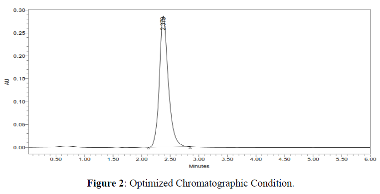 Mobile phase is Methanol: water was fixed due to good symmetrical peak. So this mobile phase was used for the proposed study. Methanol: water was selected because of maximum extraction sonication time was fixed to be 10min at which all the drug particles were completely soluble and showed good recovery. Run time was selected to be 6min because analyze gave peak around 2.3 and also to reduce the total run time.