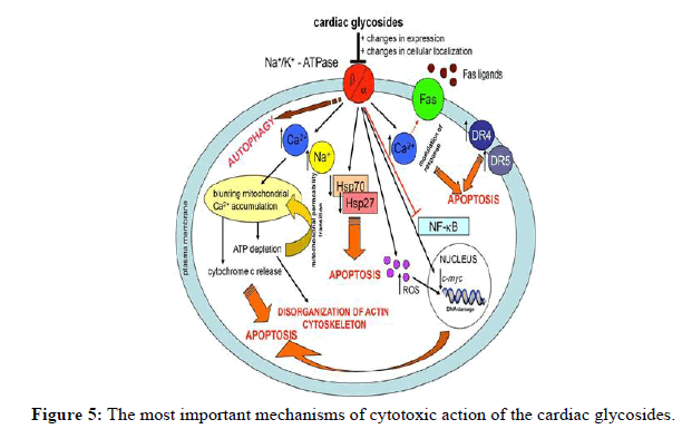 The first mechanism is based on changes in the homeostasis of Ca2+ and Na+. This leads to mitochondrial dysfunction based on blunting the accumulation of mitochondrial Ca2+. Depletion of ATP causes a mitochondrial permeability transition. These processes are completed by the release of cytochrome c and apoptosis. Disorganization of the actin cytoskeleton is induced by the depletion of ATP. Changes in the homeostasis of Ca2+ modulate the response of the fas receptor to fas ligands. CGs also up regulate two cell death receptors DR4 and DR5. CGs down regulate heat shock proteins that are important in the survival of cells under stress conditions. An increased level of reactive oxygen species (ROS) damages biomolecules, including DNA. The down regulation of the expression of c-myc is among the next mechanisms of CG action. Both the formation of ROS and the down regulation of c-myc lead to apoptosis. The down regulation of NF-B and autophagy are the next processes that lead to cell death.