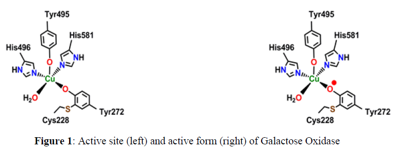 Galactose Oxidase (GO) is a fungal copper containing mononuclear metalloenzyme that catalyzes aerial oxidation of primary alcohols to their corresponding aldehydes with concomitant reduction of molecular oxygen to hydrogen peroxide [2].