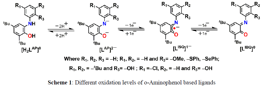 The metal complexes of o–aminophenol based ligands are currently being studied intensively. Studies on the coordination chemistry and structure–bonding correlation of o–aminophenol based redox non–innocent ligands have been a flourishing research field over several years and continue to be extensively explored. It is observed that properties of a metal multi-electron reactivity at a well-defined metal complex and play a pivotal role in catalysis. o–Aminophenol-based ligands span redox–levels from dianionic o–amidophenolate (LAP)2– to o–iminosemiquinonate(1–) monoanion (LISQ)•– π-radical to neutral o–iminoquinone (LIBQ)0 forms. Designing of non-innocent ligands and thereafter synthesis of radical complex depend on the interaction between the metal ion and the coordinating ligand. In order to prepare new coordination complexes having useful application first and foremost thing is to design new multifunctional ligand. The formation of tyrosyl radicals in the mononuclear copper enzyme galactose oxidase is a prototypical example of a class of metalloproteins to use free radicals as cofactors to promote oxidation reactions. Redox–active ligands offer an intriguing way to approach –containing transition metal complexes have biological relevance to interpret the electronic structure of several radical–containing metalloenzyme intermediate. For example, different substituent’s based 2–anilino–4,6–di–tert–butylphenol (H2L) has been found to behave as a non-innocent ligand. It provides the corresponding radical–containing manganese (IV), iron (III), cobalt (III), copper (II), nickel (II), and palladium (II) complexes [1] (Scheme 1).