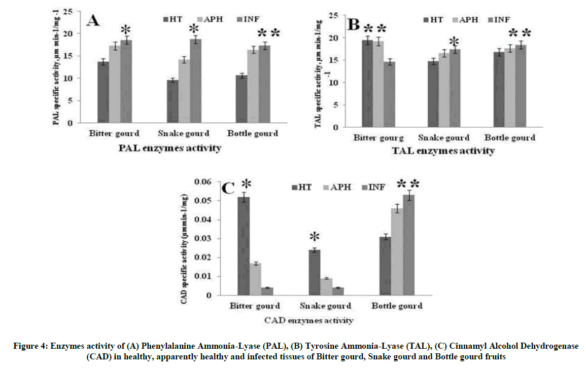 Phenylalanine Ammonia-Lyase (PAL) catalyses the first step in the biosynthesis of phenylpropanoids, which form a wide variety of defense related plant secondary products. Results infer that there was a remarkable up regulation of the PAL activity in the INF and AH tissues of bottle gourd. But INF tissues of snake gourd and bitter gourd demonstrated poor activity of PAL enzyme as compared to that of the bottle gourd. There was also severely lower levels of TAL and CAD in the INF and AH tissues of snake gourd and bitter gourd than the bottle gourd. The declined PAL, TAL, and CAD strongly correlates with the higher susceptibility to the melon fly infestation resulting in the increased B. cucurbitae larval deposition and fruit body decay (Figure 4A-C). Whereas bottle gourd accumulated defense related PPP enzymes in the infected site has lead to the minimal larval invasion and tissue damage. Therefore these results clearly indicate that possible role of PPP enzymes in providing resistance to the melon fly infestation in the cucurbitaceae vegetables.