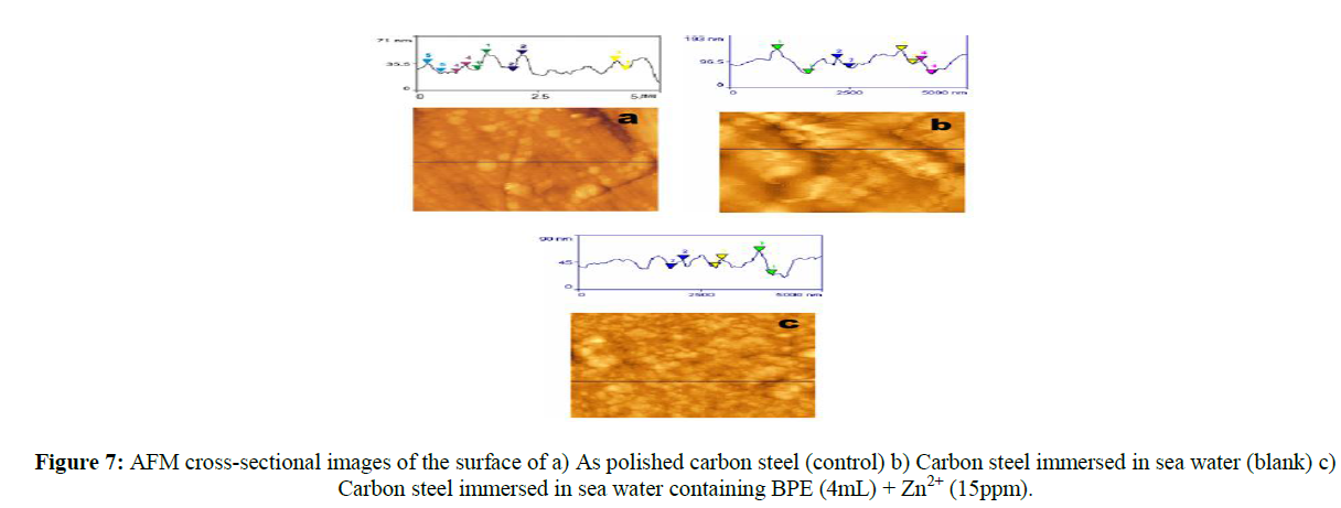 Displays the surface topography of un-corroded metal surface. The value of Rq, Ra and P-V height for the polished carbon steel surface (reference sample) are 4.3 nm, 3.41nm and 35.28 nm respectively. The slight roughness observed on the polished carbon steel surface is due to atmospheric corrosion. Fig: 4b, 5b, displays the corroded metal surface with few pits in the absence of the inhibitor immersed in sea water. The (Rq), (Ra), (P-V) height values for the carbon steel surface are 25.2 nm, 19.9 nm and 89.10 nm respectively. These data suggests that carbon steel surface immersed in sea water has a greater surface roughness than the polished metal surface, which shows that the unprotected carbon steel surface is rougher and was due to the corrosion of the carbon steel in sea water environment. Figure 4c, 5c, displays the steel surface after immersion in sea water containing 4 mL of BPE and 15 ppm of Zn2+. The (Rq) value is reduced from 25.2 nm to 8.45 nm compared with corroded metal surface , (Ra) value is reduced to 6.50 nm from 19.9 nm, (P-V) maximum peak to valley height values also was reduced to 38.63 nm , The (Rq), (Ra), (P-V) height values are considerably less in the inhibited environment compared to the uninhibited environment. These parameters confirm that the surface is smoother. The smoothness of the surface is due to the formation of a compact protective film of Fe2+ - BPE complex thereby inhibiting the corrosion of carbon steel [8].