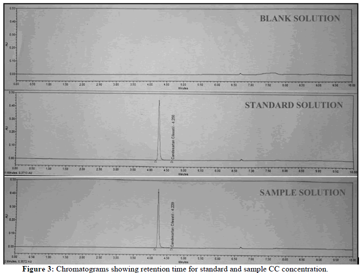 Specificity and selectivity: When comparing the results of the current study to those of past research studies on the same medication, it was discovered that the retention period with readily accessible mobile phase was superior. The approach was quantified accurately and with high resolution. It was not possible to draw any conclusions from the blank sample. A cost effective mobile phase consisting of acetonitrile and 0.1 percent orthophosphoric acid (pH 2.5) in a volumetric ratio of 35:65 v/v is utilized in this procedure. Figure 3 shows the retention time for standard and sample CC concentrations. The retention time for standard and sample CC concentrations was 4.2 minutes. When compared to other approaches that have been developed, the retention time attained was found to be shorter.