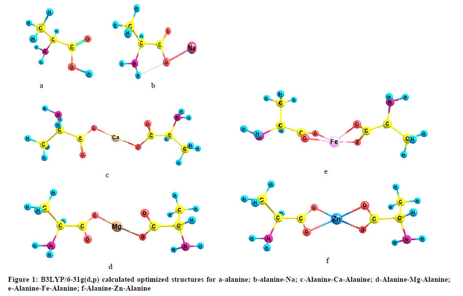The geometries of alanine; alanine-Na; Alanine-Ca-Alanine; Alanine-Mg-Alanine; Alanine-Fe-Alanine and Alanine-Zn-Alanine were built as indicated in Figure 1. The studied model molecules were optimized with Gaussian 09 soft code at Spectroscopy Department, National Research Centre [18]. The calculations were conducted with density functional theory at B3LYP/6-31g(d,p) quantum mechanical level [19-21]. Vibrational spectra were calculated at the same level of theory.