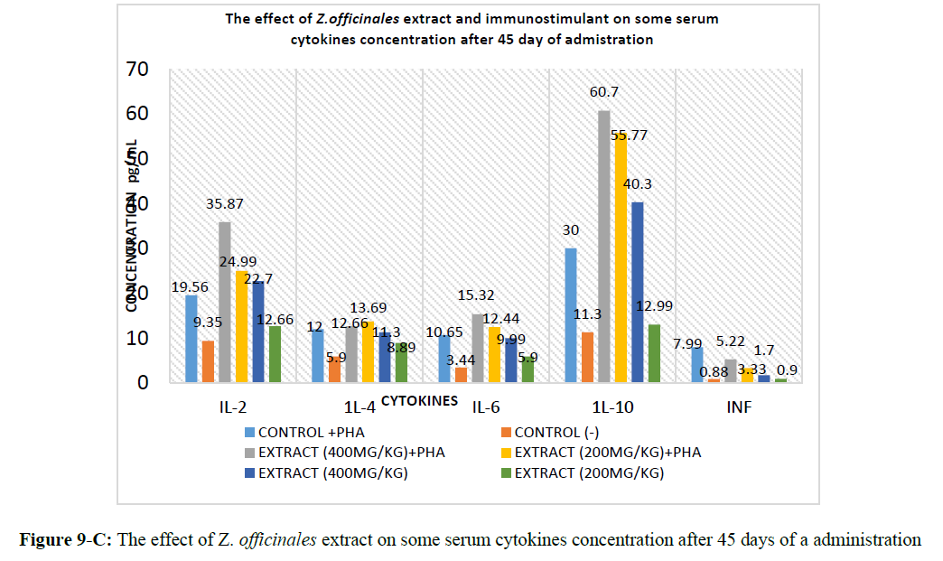 IL-2: the result of group (1) which received PHA at 0.5 I/M showed 26.44. While the control normal saline. Group (2) recorded 11.45. The group (3) which received 400 mg of the extract + the PHA showed 30.1. While the group (4) which received the extract at 400mg only recorded 22.4. However, group (5) received 200 mg extract + PHA recorded 20.33 and group (6) which received the extract only at 200 mg recorded 15.00. Showed in table no (4-B) and figure no (9-B).