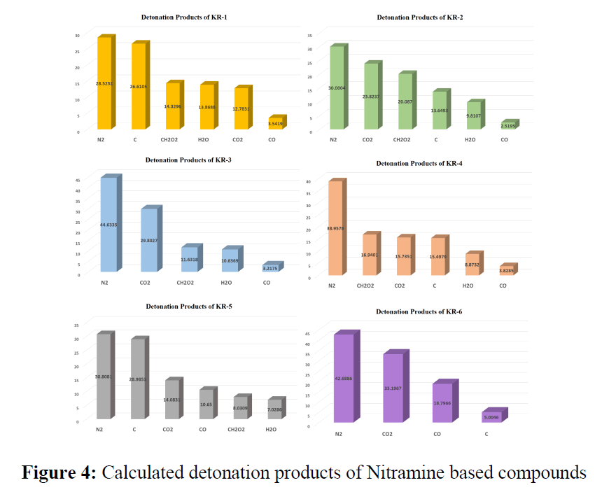 The expected detonation products of designed molecules were calculated and shown in Figure 4. It is observed that in all the cases the major detonated product is Nitrogen and in majority cases, the least detonated product is Carbon monoxide. The other detonated products include water, carbon and carbon dioxide, representing the environmental compatibility of explosives after detonation.