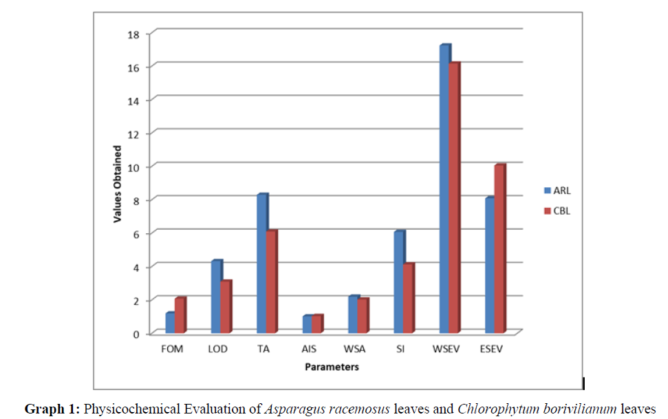 According to the standard procedures the dried plant parts of ARL: Asparagus racemosus (Leaves) and CBL: Chlorophytum borivilianum (Leaves) were used for the determination of various physicochemical parameters (Table 3-5). The results were presented in table 5.1 and Graph 1.