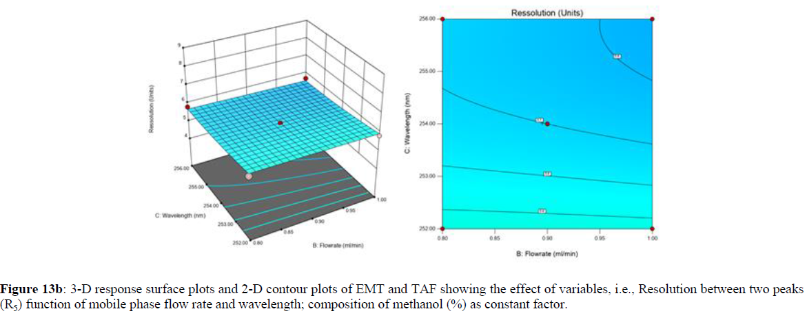 Furthermore, by demarcation in the design space region, the ideal chromatographic solution was determined using a numerical desirability function. All the interactions between dependent and independent variables were studied through quadratic equations. The independent variables (Table I) were studied for critical analytical attribute (CAA’s) (R1: Retention time for EMT, R2: Retention time for TAF, R3: Peak area of EMT, R4: Peak Area of TAF, R5: Theoretical plates of EMT, R6: Theoretical plates of TAF, R7: Asymmetry of EMT, R8: Asymmetry of TAF, R9: Resolution between two peaks).