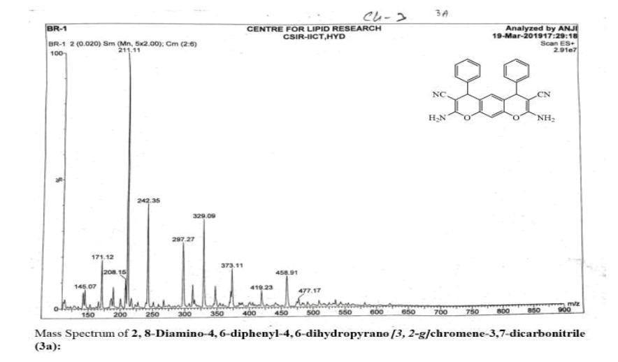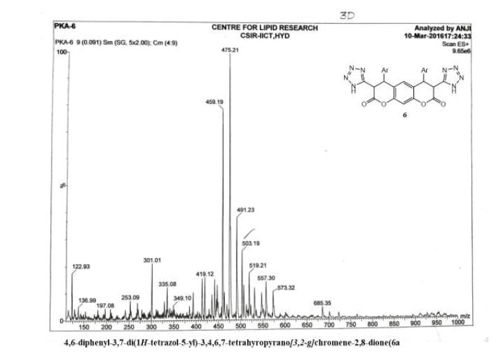 The compound 2,8-dioxo-4,6-bis(subtitutedphenyl)-7(1H-tetrazol-5-yl)-2,3,4,6,7,8-hexahydropyrano[3,2-g] chromene-3-carbonitrile 3(a-e) was obtained after multiple reaction steps starting from resorcinol. The resorcinol was condensed with malanonitrile and aromatic aldehydes (a-e) under basic conditions gave the corresponding 2,8-diamino-4,6-bis(subtitutedphenyl)-4,6-dihydropyrano[3,2-g]chromene-3,7-dicarbonitrile 1(a-e) further these compounds are treated with formic acid, deamination takes place to produced corresponding 2,8-dioxo-4,6-bis(subtitutedphenyl)-2,3,4,6,7,8- hexahydropyrano[3,2-g] chromene-3,7-dicarbonitrile 2(a-e) and these compounds are converted into corresponding 2,8-dioxo-4,6- bis(subtitutedphenyl)-7(1H-tetrazol-5-yl)-2,3,4,6,7,8-hexahydropyrano[3,2-g]chromene-3-carbonitrile 3(a-e) with sodium azide in good yields (Scheme 1). The pure compounds were obtained by re-crystallization from an ethanol as solvent. All the synthesized compounds were confirmed based on elemental analyses, IR and NMR spectral data.