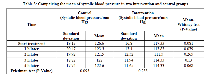 The results showed that at all times no statistically significant difference in mean of systolic blood pressure. This means that changes in systolic blood pressure in both groups did not differ at different times (Table 3).