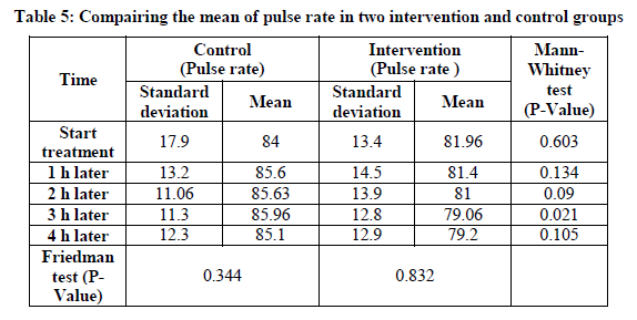 The results showed that in all times but 3 h after the intervention, the mean heart rate in both groups was not statistically significant. This means that changes the pulse in both groups did not differ at different times (Table 5).